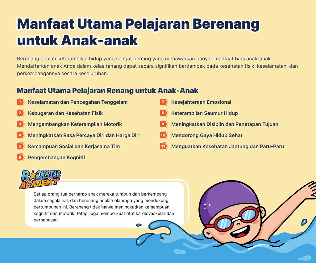 Ada banyak sekali manfaat berenang untuk anak-anak. Selain membangun gaya hidup dan tubuh yang sehat. Menurut beberapa sumber, anak-anak yang belajar berenang memiliki kemungkinan 88% lebih kecil untuk tenggelam. Berikut adalah manfaat lain yang harus Anda ketahui: