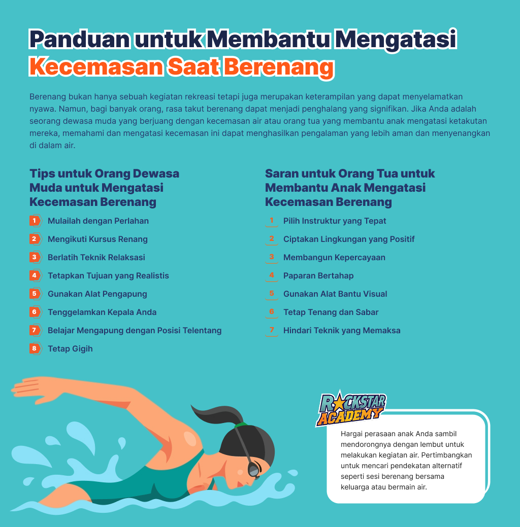Jika Anda adalah seorang dewasa muda yang berjuang melawan rasa takut berenang, berikut ini adalah beberapa tips praktis untuk membantu Anda membangun kepercayaan diri dan menaklukkan rasa cemas Anda: