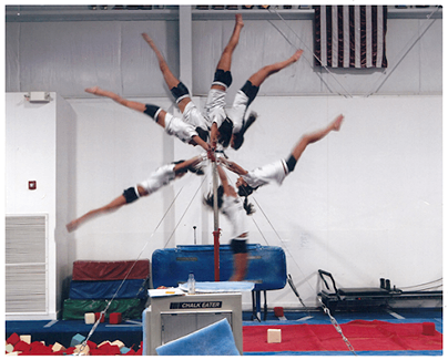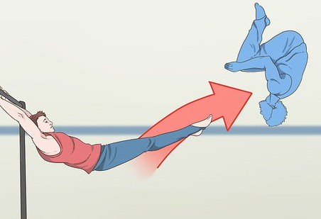 • Release the bar at the peak, initiate a front flip in a tuck, straddle, or pike position.