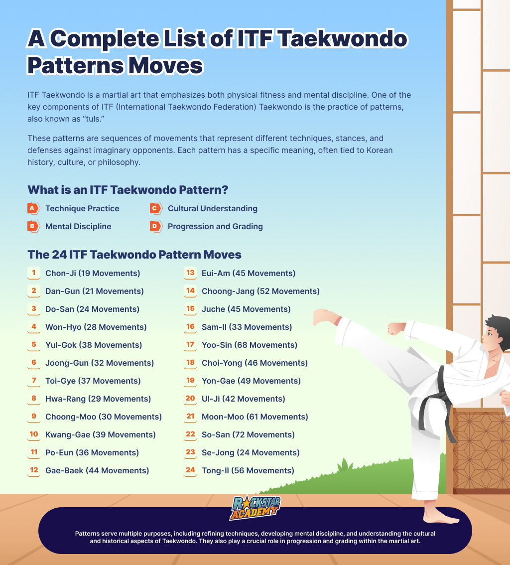 The 24 patterns in ITF Taekwondo are designed to symbolize the 24 hours in a day, representing the idea that Taekwondo is a lifelong practice. Each pattern has a unique name, usually associated with significant figures or events in Korean history.