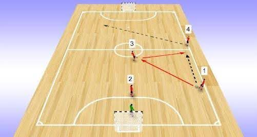 The pattern can then transition into a Give-and-Go sequence: Player #4 vacates their position momentarily to allow Player #1 and Player #3 to combine. Player #1 passes to Player #3, follows the pass, and receives the ball back in a one-two movement.