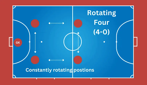 In this strategy, all four outfield players rotate positions constantly without a fixed striker.