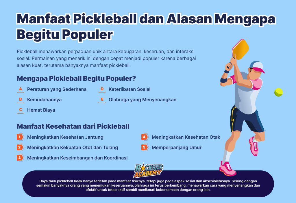 Popularitas pickleball yang semakin meningkat berasal dari kemudahannya, yang menggabungkan elemen tenis, pingpong, dan bulutangkis ke dalam permainan yang bergerak cepat dan mudah dipelajari yang cocok untuk segala usia.