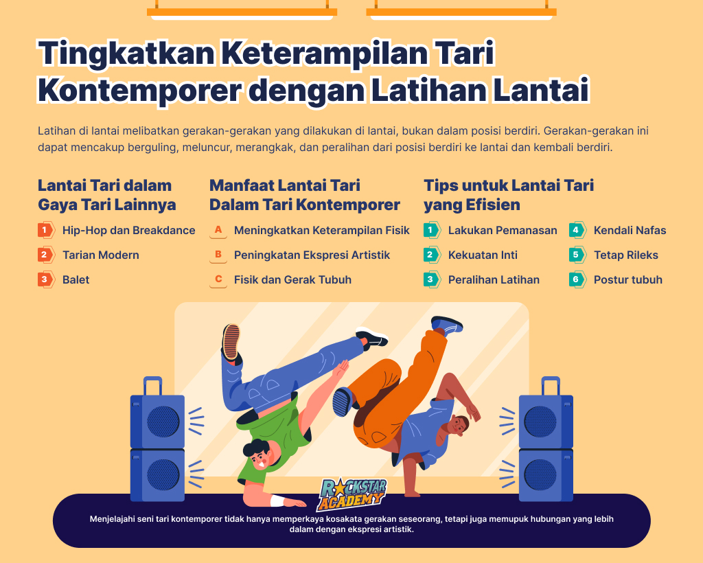 Gerakan lantai dicirikan oleh keluwesan, peralihan gerakan yang mulus, dan hubungan yang erat dengan tanah. Ini adalah komponen inti dari tarian kontemporer, yang memungkinkan para penari untuk menjelajahi dimensi baru dan rentang gerakan yang dinamis.