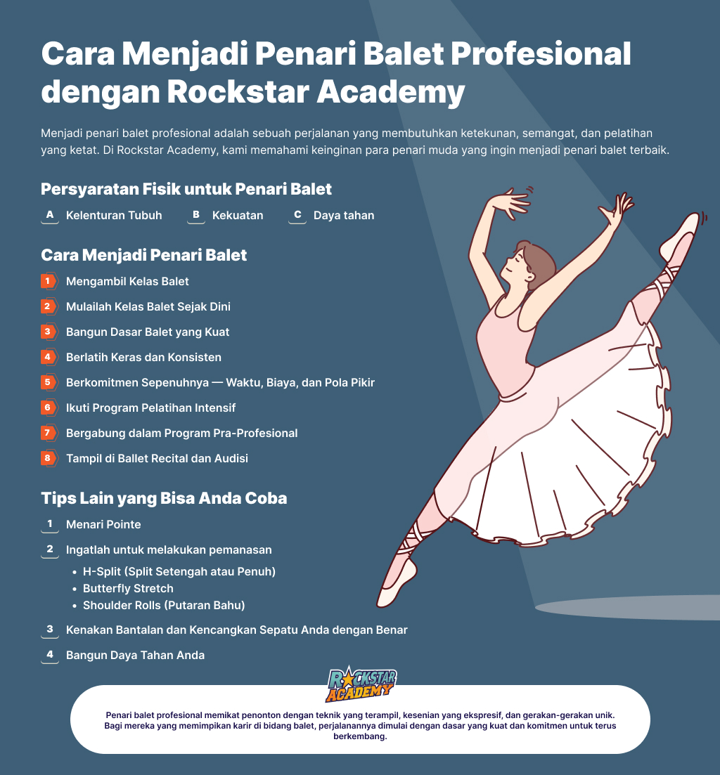 Berikut ini adalah panduan terlengkap tentang apa yang diperlukan untuk mengejar karir sebagai penari balet profesional, dan bagaimana Rockstar Academy dapat membantu mencapai impian Anda.