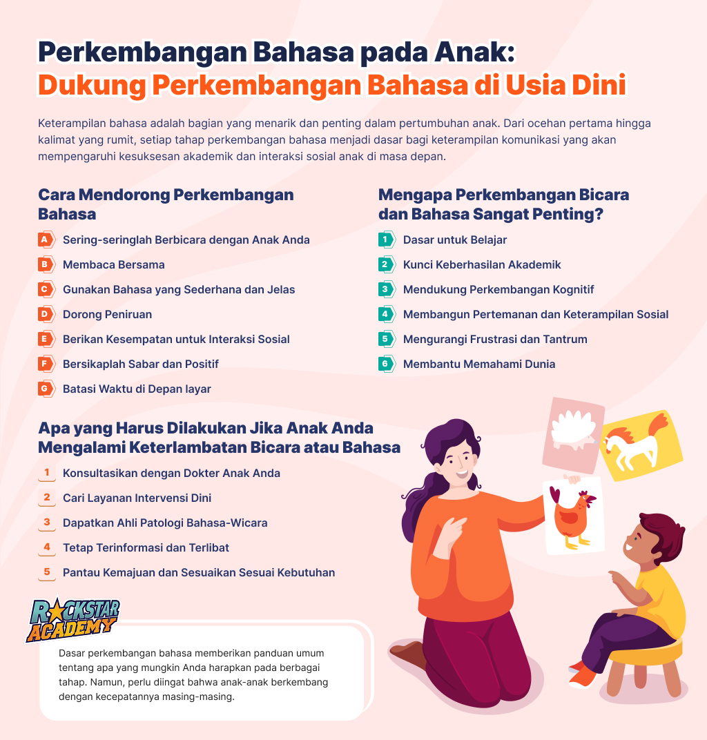 Memantau perkembangan bahasa anak Anda sangat penting untuk memastikan kesuksesan dan kesejahteraan mereka di masa depan. Salah satu cara efektif untuk mendukung aspek penting dari pertumbuhan mereka adalah dengan mendaftarkan mereka dalam program Prasekolah & Taman Kanak-kanak di Rockstar Academy.