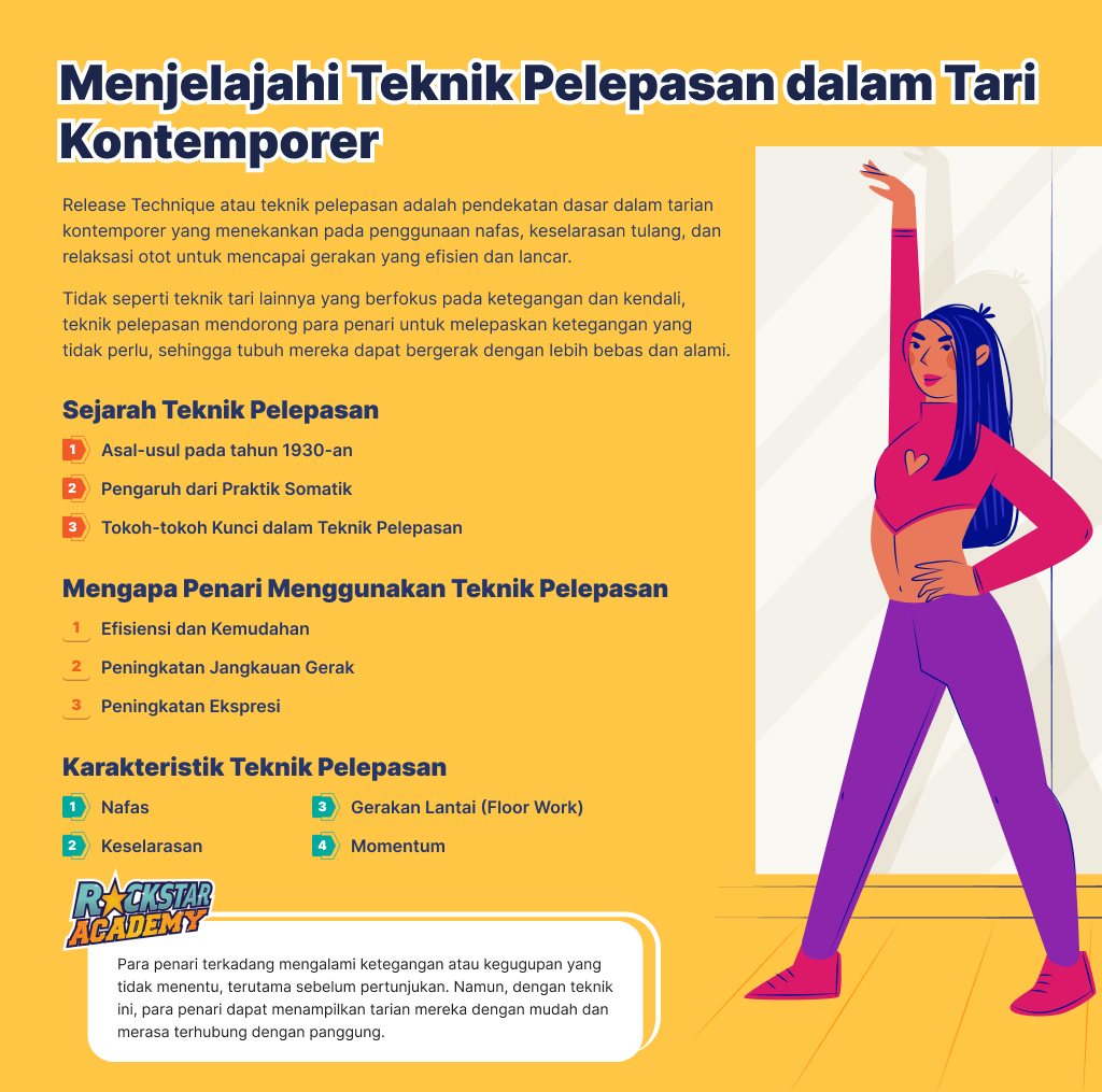 Ternyata ada sebuah teknik yang dapat meredakan hal tersebut dalam tari kontemporer, yaitu Teknik Pelepasan atau Release Technique. Teknik ini penting untuk dipelajari oleh setiap penari, terutama penari kontemporer. Artikel ini akan membahas lebih lanjut mengenai teknik ini, dan manfaatnya.